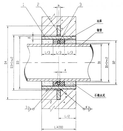 剛性防水套管適用于管道穿墻處不承受管道振動和伸縮變形的構(gòu)(建)筑物,A型適用于鋼管。從圖中可以看到套管的管材厚度為δ,套管的外徑為D3,所穿的鋼管的外徑為D1。對應(yīng)于A型剛性防水套管的各個部位的尺寸。舉個例子,DN50的A型剛性防水套管,它的外徑為D3=114,而能夠穿的鋼管的外徑為D1=60。再舉個例子,DN80的A型剛性防水套管,它的外徑為D3=140,而能夠穿的鋼管的外徑為D1=89。鋼管的公稱直徑與外徑的對照表,DN50的鋼管的外徑為57(B型),DN80的鋼管的外徑為89(B型)。(注:B型指國內(nèi)沿用系列<公制管>)